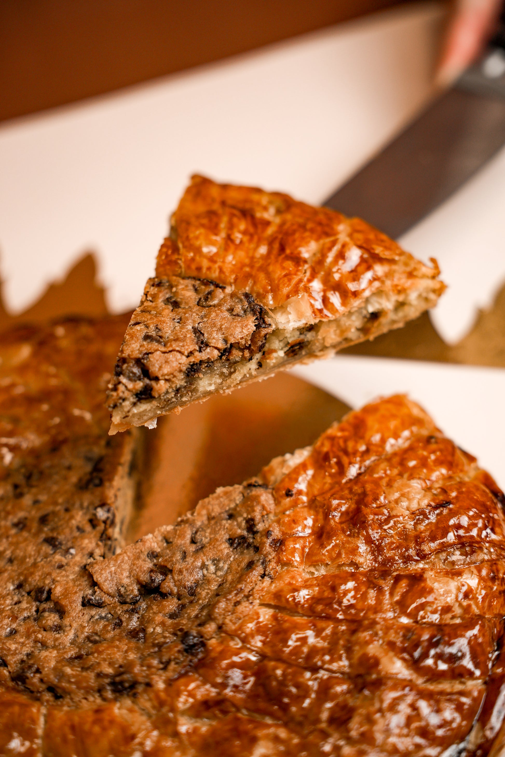 Frangipane aux amandes brutes et morceaux de cookie chocolat noir et chocolat aux lait fleur de sel. Le tout enrobé avec une fine couche de sirop.